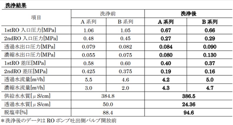 - 定期洗浄で回復しないROが化洗研の洗浄により回復してRO膜のライフの延長ができました。